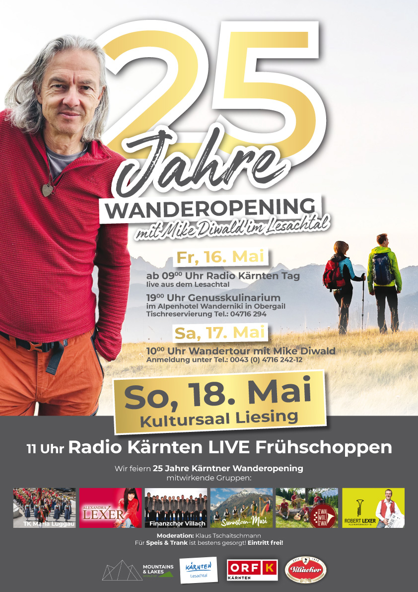 Mit dem Kärntner Wanderopening startet der Süden Kärntens in den Sommer. Wanderliebhaber erwartet ein abwechslungsreiches Programm: Bereits am Freitag berichtet Radio Kärnten live aus dem Lesachtal. Für Genussliebhaber gibt’s am Abend das traditionelle „Genusskulinarium“ im Alpenhotel Wanderniki. Am Samstag wird gemeinsam mit Mike Diwald gewandert und im Rahmen eines Radio Kärnten Live Frühschoppen am Sonntag, das 25 Jahr Jubiläum gebührend gefeiert. Musikalisch mit dabei sind die TK Maria Luggau, Alexandra Lexer, der Finanzchor Villach, die Sunnstan-Musi, die Gruppe Zwa Mol Zwa und Robert Lexer. Beginn ist um 11 Uhr im Kultursaal in Liesing, Eintritt frei!