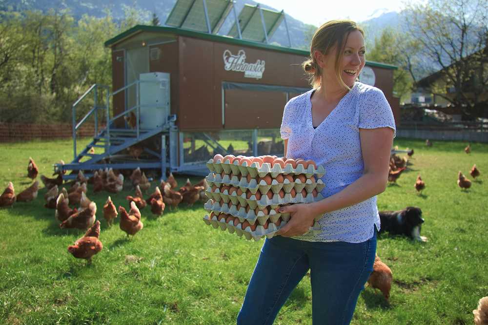 Über 1000 glückliche, artgerecht gehaltene Hennen sorgen für täglich frische Eier, die sowohl verkauft als auch für die hauseigenen Nudeln verwendet werden. Auf ein Kilogramm Hörnchen-Nudeln werden sage und schreibe 7 Eier verarbeitet!