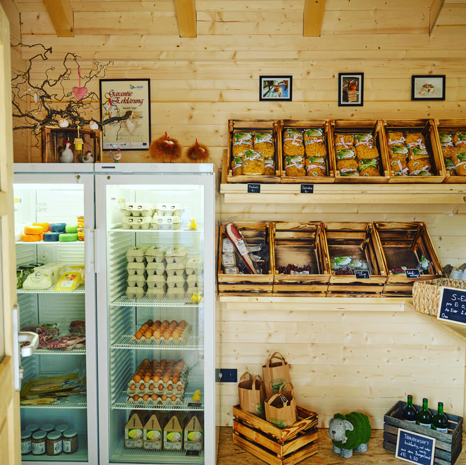 Im kleinen, einladenden Hofladen finden sich weitere Spezialitäten regionaler Partner: Gailtaler Almkäse, herzhafter Speck und würzige Würste aus dem Gailtal, geräucherter Fisch, diverse Milchprodukte, Knoblauch und weitere Schmankerln sowie erfrischende Säfte.