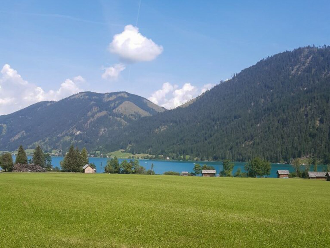 Von nun an geht es erstmals wieder bergab – und das immer steiler, so steil, dass selbst entgegenkommende E-Mountainbiker schwitzen, die meisten „echten“ Radfahrer schieben da sowieso. Und dann, nach 1 Stunde 30 Dauerlauf, sehe ich das erste Mal das türkis leuchtende Wasser des Weissensees zwischen den Bäumen. Ich komme beim Paterzipf aus dem Wald heraus und genieße das Panorama.