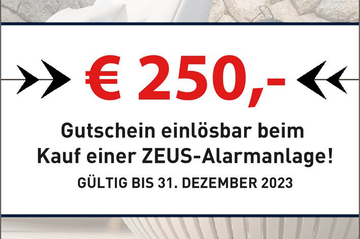 Profitieren Sie von einem Gutschein über € 250,- beim Kauf einer ZEUS-Alarmanlage!